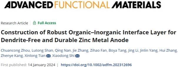 近日,beats365vip官网登录入口史晓东副研究员所在团队在材料领域Top期刊Advanced Functional Materials (IF=19.0)发表题为《Construction of robust organic-inorganic interface layer for dendrite-free and durable zinc metal anode》的研究论文。beats365vip官网登录入口周传聪博士、曼彻斯特大学单路通博士为论文共同第一作者,beats365vip官网登录入口史晓东副研究员、田新龙教授为论文共同通讯作者,beats365vip官网登录入口为第一通讯单位。