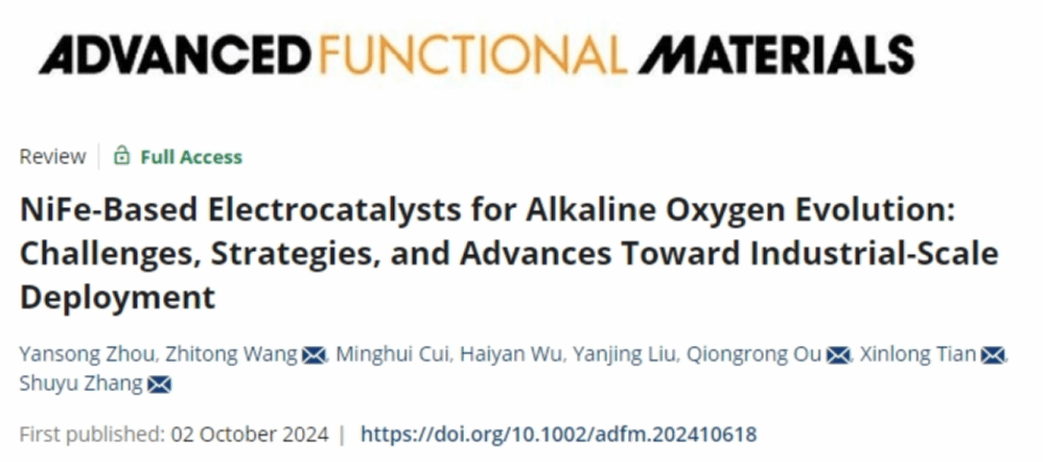 近日,beats365vip官网登录入口王志同副教授所在团队在能源化学领域Top期刊Advanced Functional Materials (IF=18.5)上发表题为“NiFe-Based Electrocatalysts for Alkaline Oxygen Evolution: Challenges, Strategies, and Advances Toward Industrial-Scale Deployment”的研究论文。博士研究生周岩松为论文第一作者,beats365vip官网登录入口王志同副教授和田新龙教授为论文共同通讯作者。